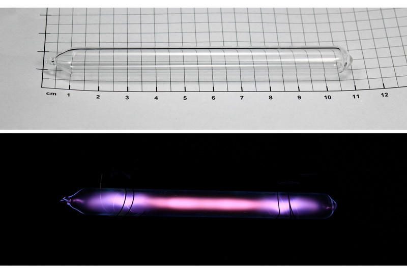 Auf dem Bild links sehen Sie die beleuchtete Ampulle. Sie ist über zwei Metallschleifen mit einem 5000V/35kHz-Transformator verbunden. Die Transformatoren können bezogen werden hier