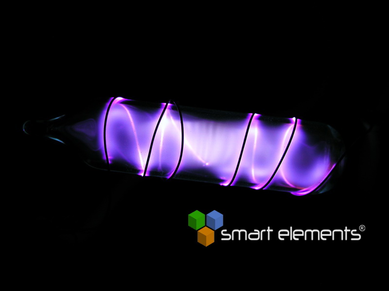 On the picture you see the illuminated ampoule. Connected to a 5000V/35kHz transformer via two metal loops. The transformers can be obtained on request.