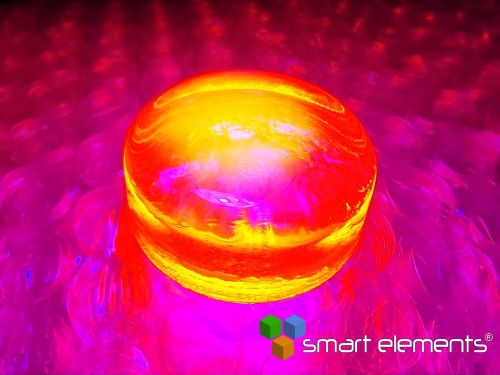 This slightly rose colored glass is used in optics application where high levels of Eu doping is needed. It shows one of the strongest fluorescence observed for glass, so far.