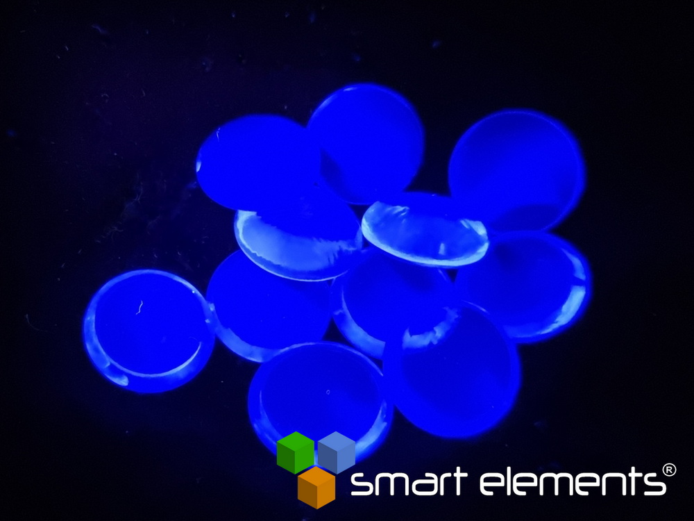 Deep blue luminescence (450nm) from 1D2 → 3F4 transition under 365nm UV excitation.
